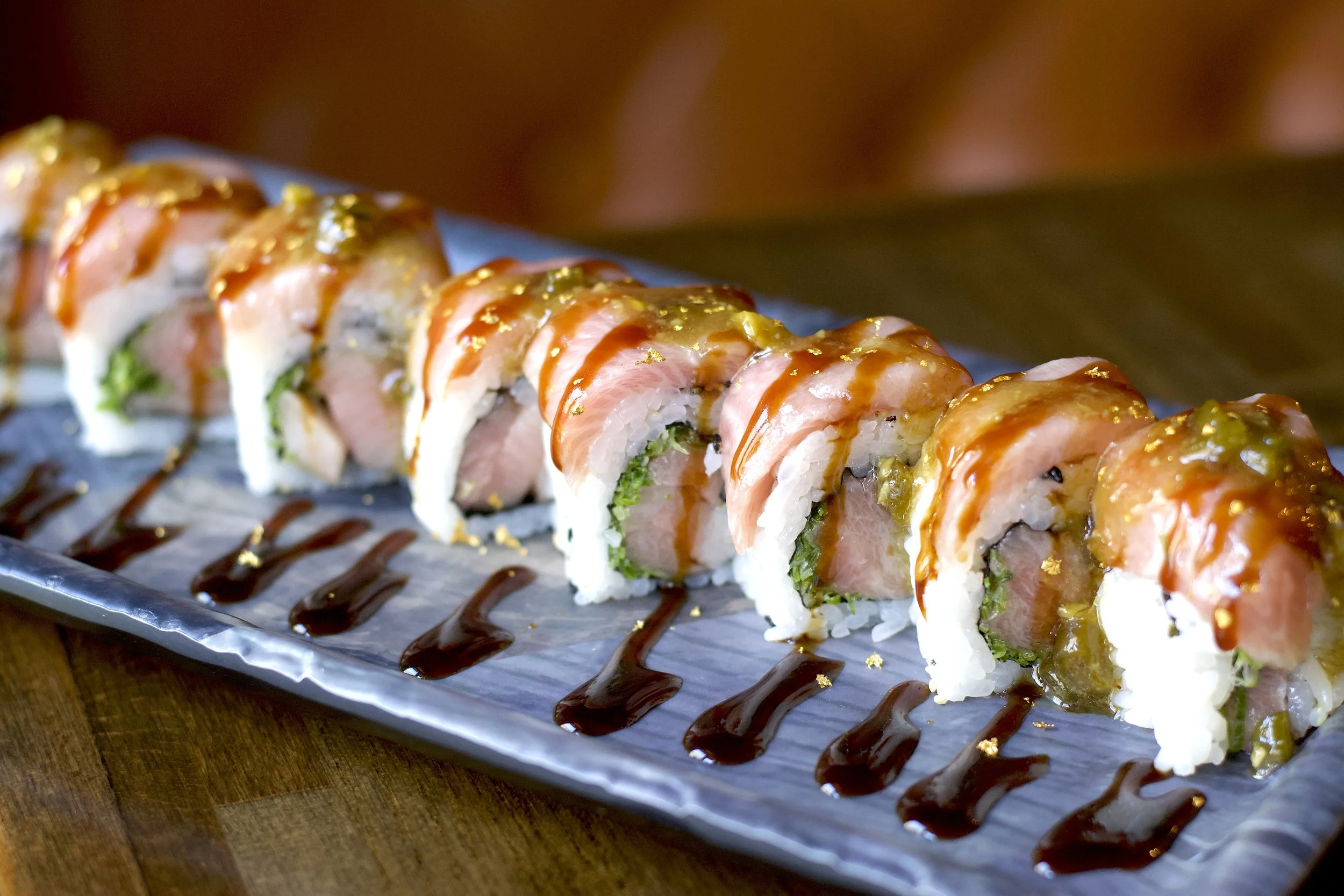 Premium Otoro layered both inside and out, brushed with truffle oil, drizzled with kizami wasabi sauce, and crowned in 24K gold leaf.
