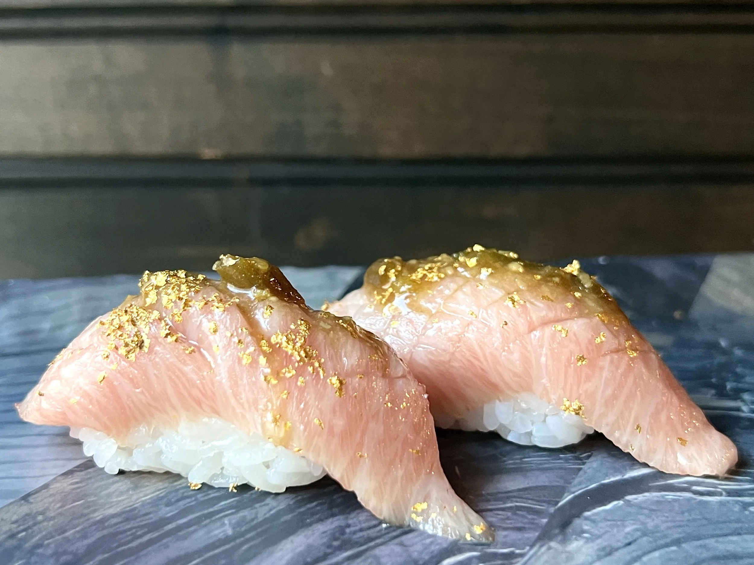 Premium Otoro topped with house-made kizami wasabi sauce and a touch of 24K gold.